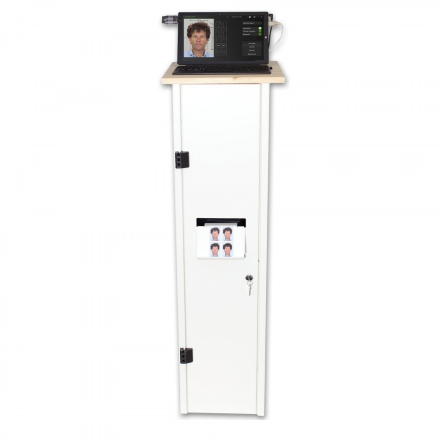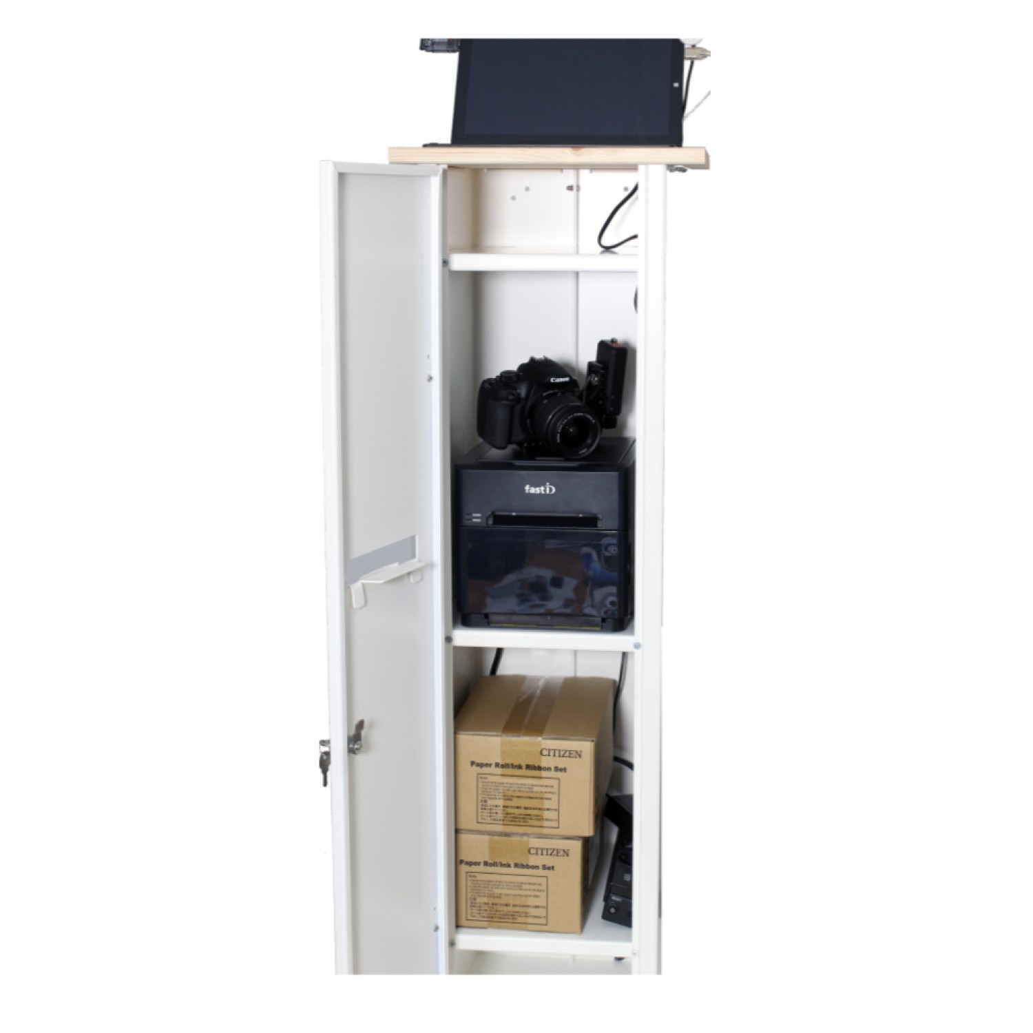Au-delà de son apparence élégante, le pied fastID a été pensé pour répondre aux exigences de sécurité et de praticité propres à un usage professionnel. Il est équipé d’un compartiment intérieur accessible par une porte verrouillable à clé. Ce volume de rangement permet d’accueillir l’ensemble des équipements nécessaires au fonctionnement du fastID, notamment l’imprimante, plusieurs boîtes de papier ainsi que la caméra. Cette solution intégrée permet de conserver tous les éléments sensibles à l’abri, limitant les risques de vol ou de dégradation. Les câbles sont entièrement dissimulés à l’intérieur de la structure, contribuant à une installation propre, ordonnée et sécurisée. Aucun fil apparent ne vient perturber l’esthétique globale ni gêner les utilisateurs, ce qui renforce à la fois la sécurité et le confort d’utilisation.