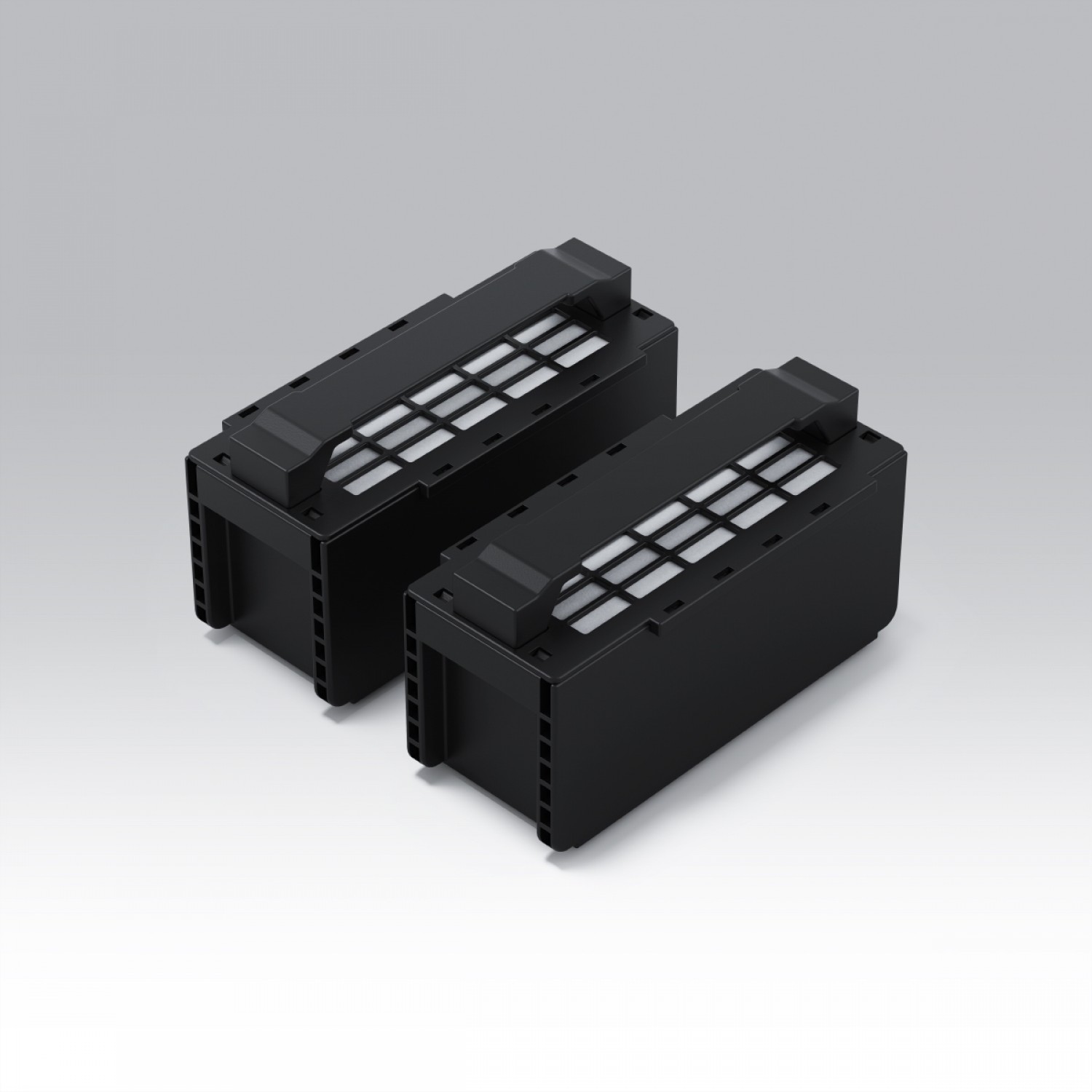 Le kit intègre deux filtres à charbon actif prévus pour le remplacement simultané des unités avant et arrière de l'imprimante. Chacun loge dans un carter rigide en polymère noir, avec ailettes latérales, conçu pour s'emboîter précisément dans les emplacements prévus à cet effet sur la SC-V1000. Ce remplacement en binôme assure une couverture complète du flux d'air interne, interceptant les vapeurs UltraChrome UV avant qu'elles ne se diffusent dans la pièce.
