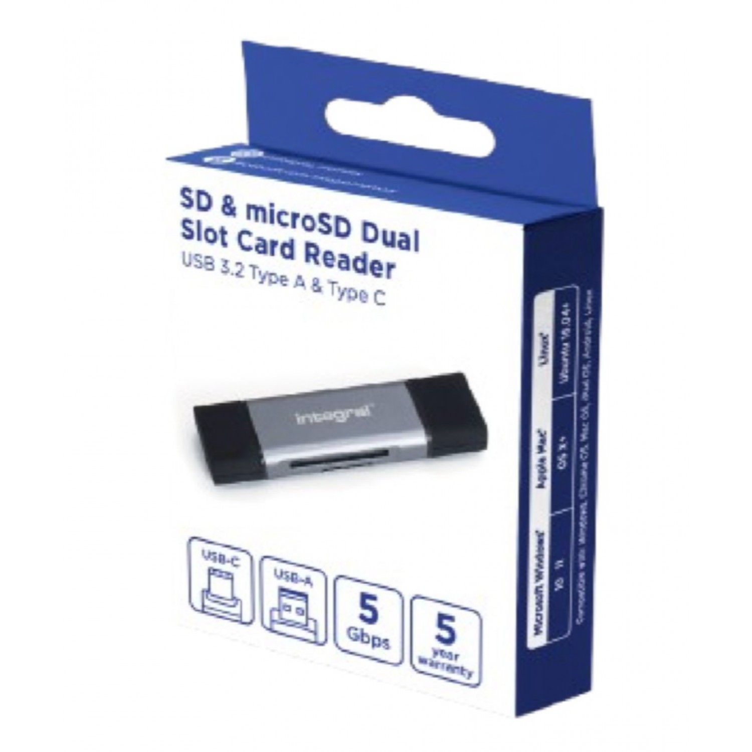 Le lecteur de cartes SD et microSD à double connectique d’Integral est la solution idéale pour transférer rapidement et facilement vos photos, vidéos et fichiers depuis vos supports mémoire. Conçu pour offrir une compatibilité maximale, il intègre deux connecteurs : USB 3.2 Gen 1 Type-A et USB Type-C. Grâce à cette polyvalence, il s’adapte aussi bien aux ordinateurs portables traditionnels qu’aux appareils modernes tels que les smartphones Android, les MacBook, les iPad Pro ou encore les PC équipés des dernières normes USB.