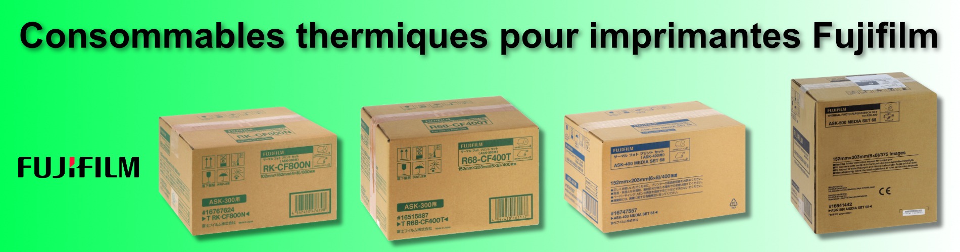 Pour les modèles plus récents, le consommable thermique Fuji ASK-400 largeur 152 mm combine efficacité et flexibilité. Il permet d'obtenir 800 photos en 10x15 ou 400 en 15x20, ce qui en fait un atout précieux pour les ateliers qui jonglent entre plusieurs formats de tirages.