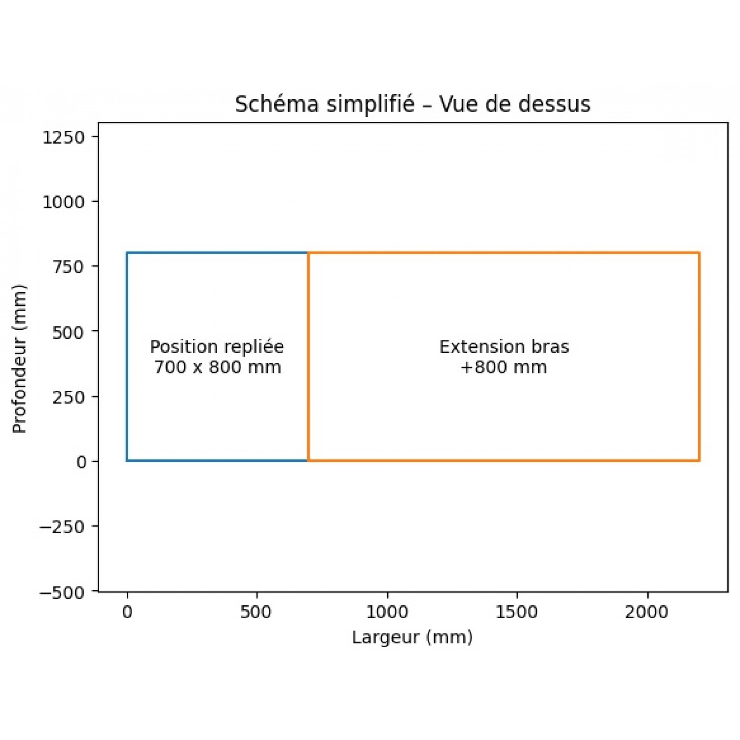 Dans cette configuration, le bras est avancé vers l’avant pour permettre la prise de vue, ce qui augmente l’encombrement horizontal et réduit légèrement la hauteur totale.